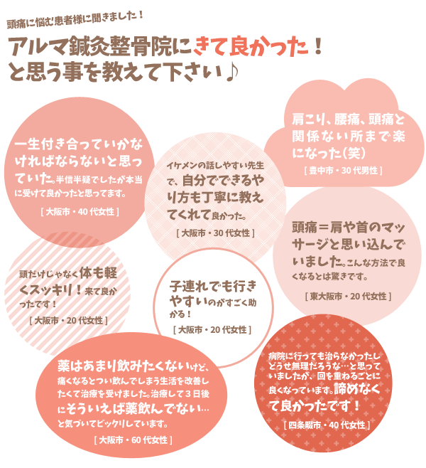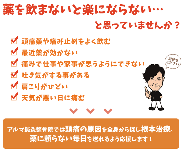 頭痛は肩こりや姿勢の崩れからくるものなど、暮らしの中にも頭痛の原因はたくさん転がっています。薬に頼らない、笑顔の多い健康な毎日が送れるよう、一緒に根本から治して行きましょう!