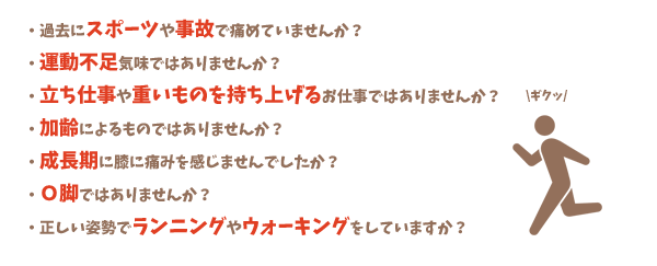 加齢やウォーキング、日本人の8割~9割ともいわれるO脚などどんな方にも当てはまる可能性があります。今は良くても将来自分の足でしっかり歩くためにも、まだ痛みがひどくないうちに原因を探してしっかりと治療を受けましょう。