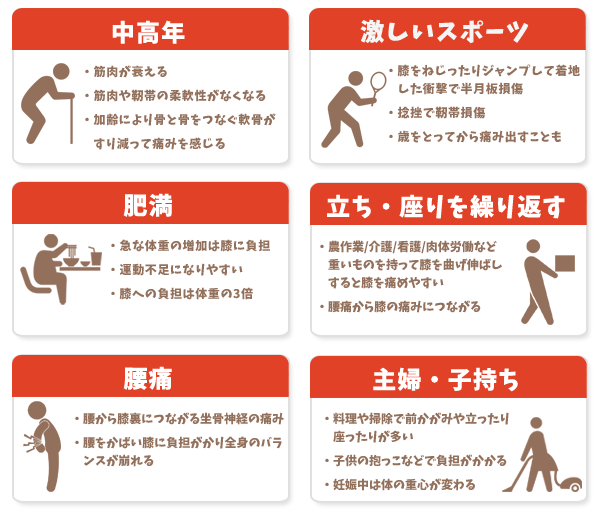 急な強い痛みが見られたり、膝が腫れて熱をもっている場合は氷などで冷やして下さい。無理に動かしたり階段の上がり下がりはできるだけ控えましょう。