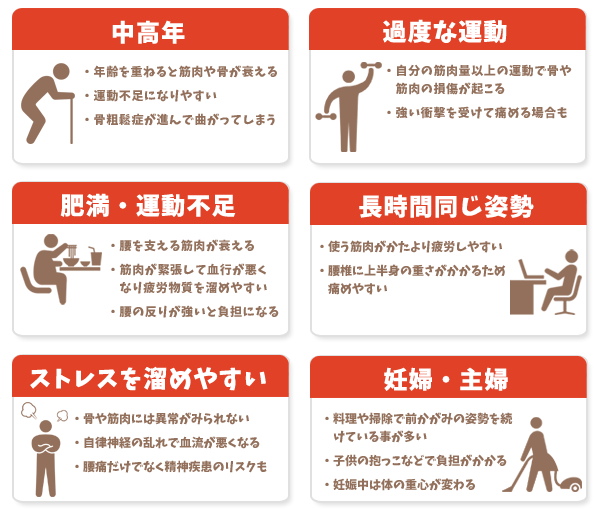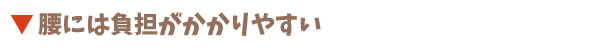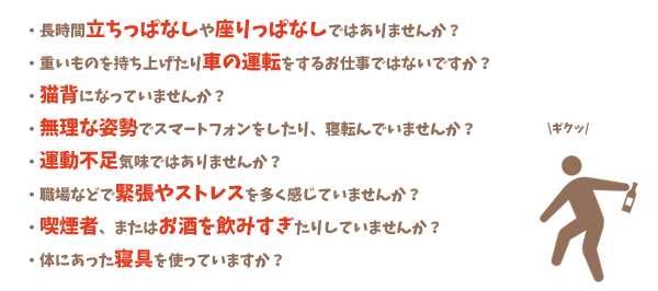 このように、腰痛になりやすいタイプはさまざま。その他にも、重い荷物を運ぶ事はもちろん、きつい下着をつけていると締め付けにより血行が悪くなり、ぎっくり腰になりやすくなります。ハイヒールを履くと体のバランスが崩れ、腰への負担を大きくします。当てはまる項目がひとつでもあれば要注意!