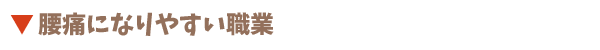 いわゆる立ち仕事です。常に腰椎で上半身の重さを受け止めていることになります。蓄積型の筋肉疲労と腰の反り返りで椎間板へ大きな負担がかかります。また、女性でサービス業についておられる方は仕事中にヒールを履く事で体のバランスが崩れ、腰痛のリスクが高まります。